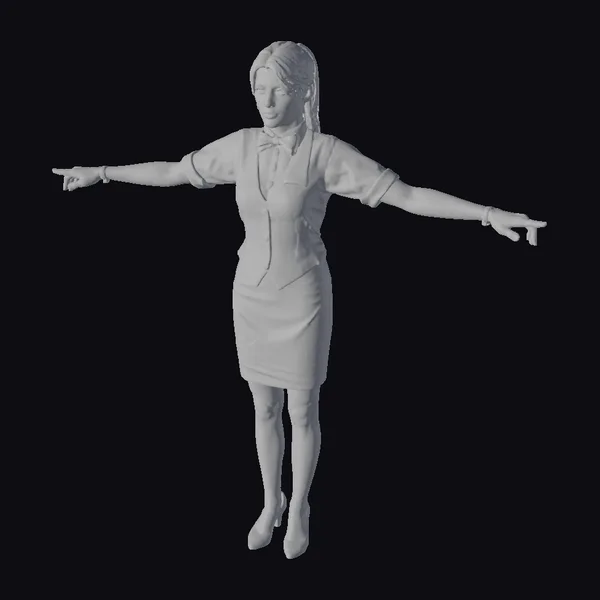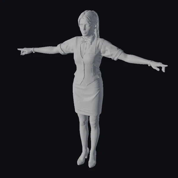 Standing tall with her arms outstretched, this 3D model of a businesswoman exudes confidence and poise. Her blonde hair is pulled back into a sleek ponytail, revealing a focused expression on her face. She wears a white shirt with rolled-up sleeves, a gray vest, and a fitted pencil skirt that accentuates her professional style. Black heels and a stylish bow tie add a dash of elegance to her outfit. The model’s realistic appearance makes her suitable for various applications, including games, 3D printing, VR/AR experiences, animation, and design projects. Her detailed features and fashionable attire ensure she can seamlessly integrate into any modern setting.