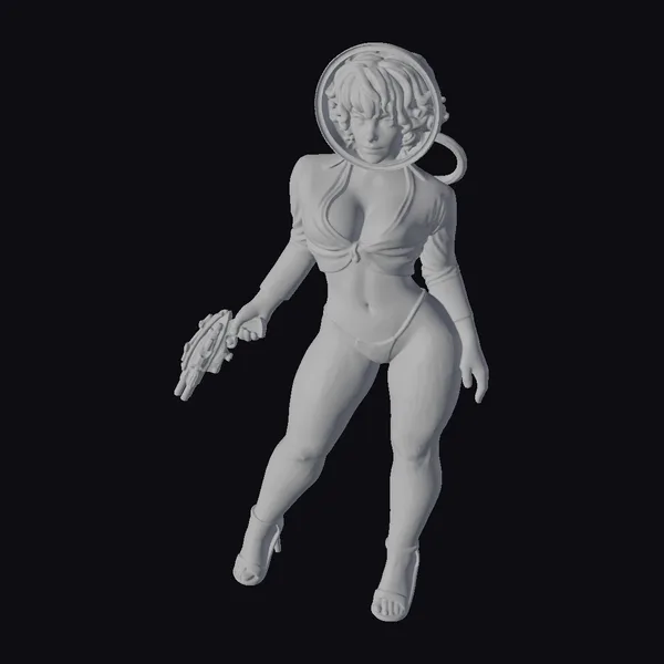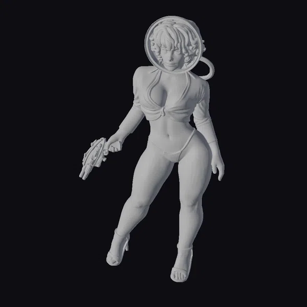 Detailed with precision, this 3D model showcases a blonde woman dressed in a metallic space suit, complete with a transparent space helmet and a futuristic gun in her hand. Her pose is dynamic, with one leg slightly bent and the other extended, giving her an air of readiness. The metallic sheen of her suit contrasts with her smooth, pale skin, while her blonde hair peeks out from under her helmet. The model’s high heels add a touch of glamour to her overall sci-fi aesthetic. This model is perfect for projects requiring a blend of fashion, futurism, and empowerment, such as animations, games, or virtual reality experiences.