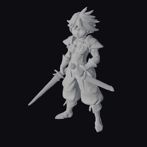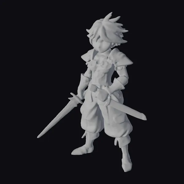 This stylized character model depicts a young warrior with a confident stance, sporting spiky blonde hair and donning a suit of armor that shines with a metallic sheen. The armor features a distinctive design with shoulder guards and articulated parts for mobility. The warrior’s outfit is complemented by vibrant yellow and purple pants, adding a pop of color to the overall appearance. A sword with a striking blue blade is held firmly in the warrior’s hands, completing the heroic look. The model’s details, from the texture of the armor to the expression on the warrior’s face, are meticulously crafted to evoke a sense of courage and adventure. Ideal for use in games, animations, or as a design reference.