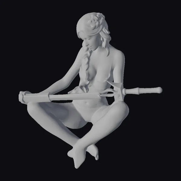 This captivating 3D model depicts a blonde female warrior in a stylized, serene pose, sitting cross-legged while holding a pair of swords. Her long blonde hair is braided, cascading down one side of her face, complementing her green bikini. The model showcases intricate details such as the texture of her hair, the sheen of her skin, and the metallic finish of the swords. Ideal for use in games, animation projects, or as a design reference, this model brings a touch of fantasy and strength to any creative endeavor.