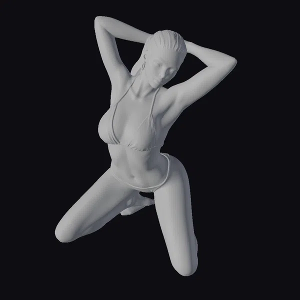 Detailed from head to toe, this 3D model of a blonde woman in a black bikini showcases a kneeling pose with her arms raised above her head, highlighting her toned physique and sensual demeanor. The realistic style focuses on accurate proportions, detailed textures, and lifelike expressions. Her blonde hair is styled in a sleek, pulled-back look, complementing her black bikini and enhancing her overall appeal. The model’s facial features are finely tuned, with a subtle expression that adds to her allure. Ideal for projects requiring a realistic, adult-themed character, such as games, animations, or designs aimed at mature audiences.