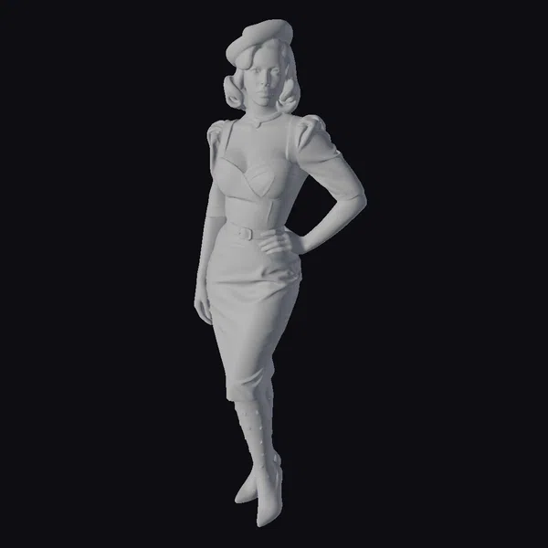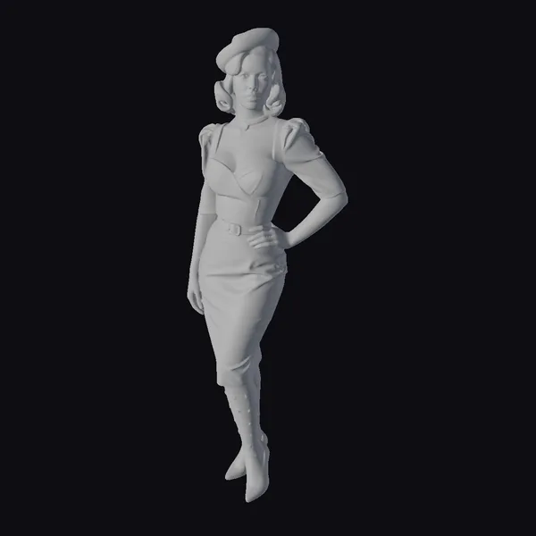 Crafted with meticulous attention to detail, this stylized 3D model of a blonde woman in a green dress is a masterpiece of digital artistry. Her blonde locks cascade in soft waves, framing a face adorned with bold red lipstick and a chic black beret. The dress, a stunning emerald green, hugs her curves in all the right places, complemented by a brown belt and black heels. The model’s pose, with one hand on her hip and the other relaxed by her side, exudes confidence and sass. Her black tights, dotted with tiny polka dots, add a playful touch to her overall look. This model is perfect for use in games, animation, VR/AR experiences, and design projects, offering a versatile and eye-catching character to bring your creative vision to life.
