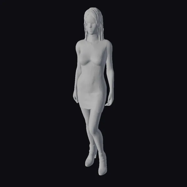 Detailed from head to toe, this 3D model showcases a young woman with a photorealistic finish. Her blonde hair is styled sleek, falling down her back in soft waves. The gray leather dress hugs her figure, accentuating her curves, while black boots add a touch of edginess. With a confident stance and direct gaze, she exudes a sense of sophistication. Her facial features are finely detailed, with a subtle expression that adds to her allure. This model is ideal for use in games, 3D printing, VR/AR experiences, animation, and design projects where a high-fashion character is needed.