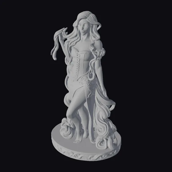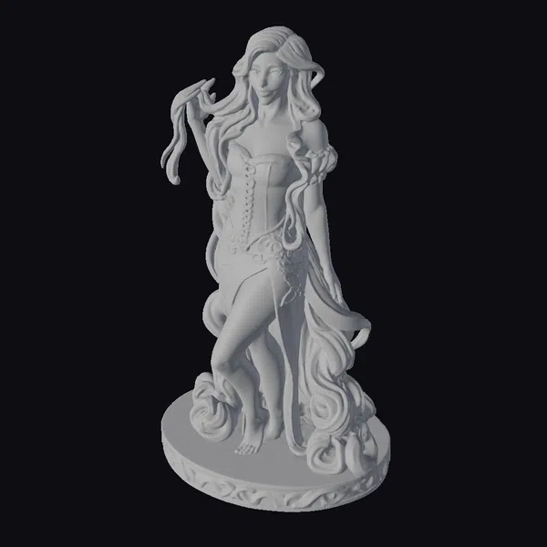 Gazing serenely into the distance, this blonde woman in a gray gown stands tall on a decorative base, her long hair flowing around her like a river of gold. The stylized model captures her poised gesture and elegant dress with intricate details, from the corset’s lace to the swirling curls at her feet. Her barefoot stance adds a touch of vulnerability to her otherwise statuesque presence. This 3D model is perfect for games, animation, or design projects seeking a touch of fantasy and femininity.