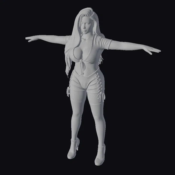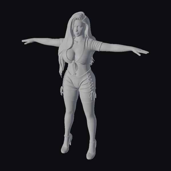 Detailed in every aspect, this stylized 3D model of a blonde woman showcases a dynamic pose with arms stretched out to the sides. Her facial features are accentuated with makeup, and her long blonde hair is styled in loose waves. She wears a white short-sleeved top tied at the front, revealing her midriff, paired with black leather shorts that have lace-up details on the sides. Her legs are adorned with white thigh-high socks and black high-heeled shoes. The model’s proportions are well-defined, with attention to detail in her musculature and anatomy. The textures of her clothing and accessories add to the realism, making this model suitable for various applications such as game development, animation, virtual reality experiences, and architectural visualization.