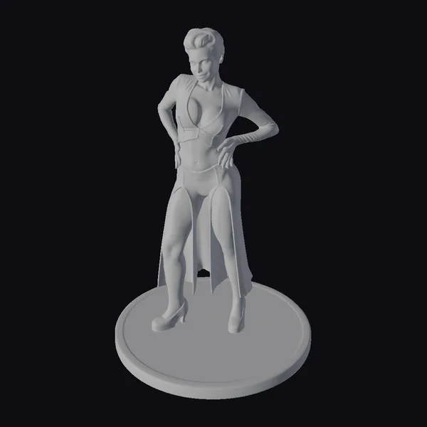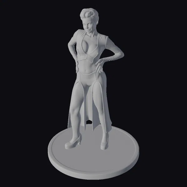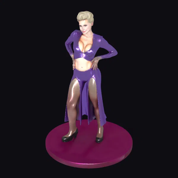 Standing tall on a rich, magenta base, this stylized blonde woman is a masterpiece of digital artistry. Her short, spiky blonde hair frames her face, which is set in a sultry expression. The purple ensemble, consisting of a bra, high-waisted shorts, and a flowing jacket, showcases her toned physique. The metallic finish of her outfit catches the light, adding depth to her already captivating presence. With her hands on her hips and legs slightly apart, she commands attention. Her black high heels add a touch of sophistication to her overall look. This model is perfect for projects requiring a blend of style, confidence, and allure, such as animations, games, or architectural visualizations.