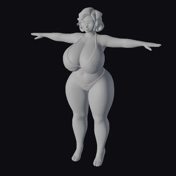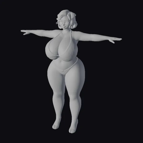Detailed with precision, this cartoon-style 3D model showcases a plus-sized woman with a radiant complexion and blonde hair styled in loose waves. She wears a teal bikini that accentuates her curves, along with purple glasses and high heels, exuding a sense of sass and charm. Her arms are outstretched, capturing a moment of freedom and joy. The model’s textures are smooth, with subtle shading that enhances her cartoonish appeal. Ideal for projects requiring a lively, animated character, such as animations, games, or virtual reality experiences.