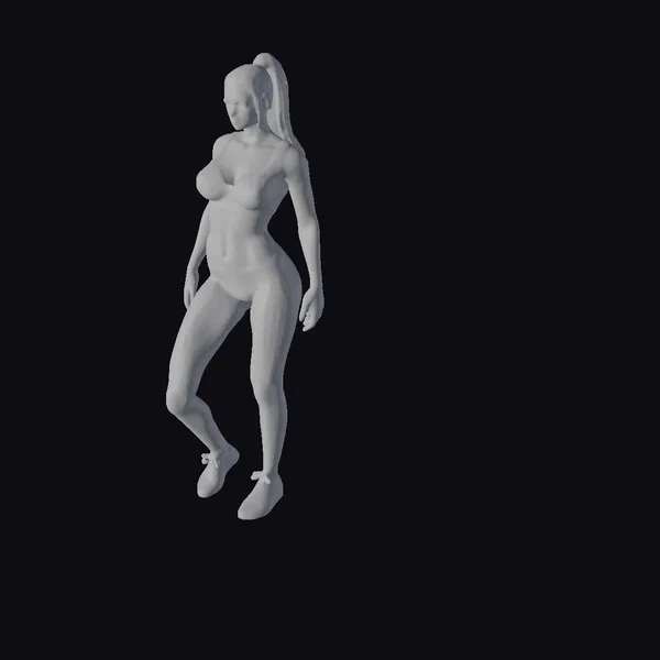 Rendered with meticulous attention to detail, this 3D model showcases a blonde woman in a dynamic pose, dressed in a form-fitting white top and dark grey leggings, complemented by matching grey sneakers. Her blonde hair is pulled back into a high ponytail, and her expression is one of focused calmness. The model’s physique is well-defined, highlighting her athletic build. The level of detail in the textures, from the sheen of her hair to the fabric of her clothing, is exceptional. This model is perfect for projects requiring a realistic human character, such as video games, animations, virtual reality experiences, and architectural visualizations where human presence is essential.