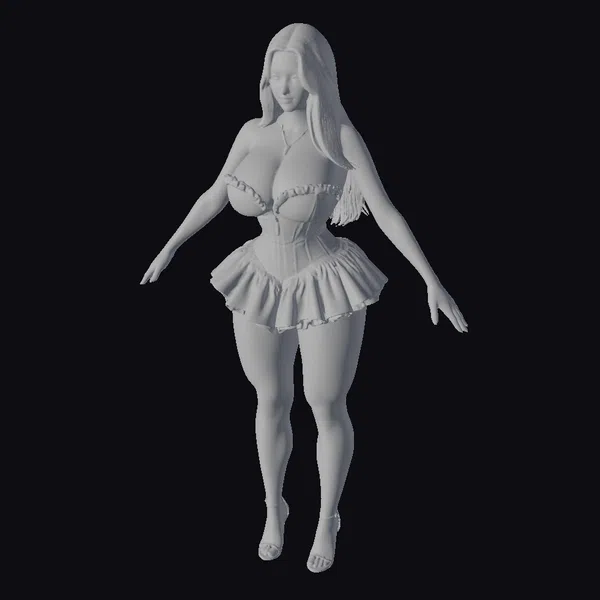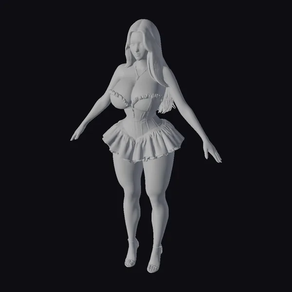 This realistic 3D model of a blonde woman in a pink dress is meticulously detailed, from the texture of her skin to the intricate folds of her dress. She stands with her arms outstretched, her hands relaxed, and her legs slightly apart, giving the impression of a dynamic movement. The dress, a masterpiece of digital fashion, features a corset-style top with a sweetheart neckline and a short, ruffled skirt that adds a playful touch. Her blonde hair flows down her back, and her high heels complete the outfit. This model is perfect for use in various projects, such as games, animations, virtual reality experiences, and 3D printing. The level of detail and realism makes it an excellent choice for designers and artists looking for a high-quality character model.
