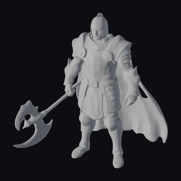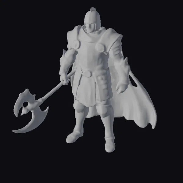Standing imposingly with feet shoulder-width apart, the crusader knight’s armor tells tales of brutal battles – scratches and bloodstains adorn his once polished suit. The silver helmet, complete with a visor, casts a shadow over his determined face. A broad cape flows behind him, suggesting movement even in stillness. The crusader’s muscular build is evident under the armor, emphasizing his readiness for combat. His right hand grips the handle of a large, blood-stained battle-axe, its blade gleaming menacingly. This model is perfect for projects requiring a medieval warrior, suitable for games, 3D printing, VR/AR experiences, animations, or historical designs.