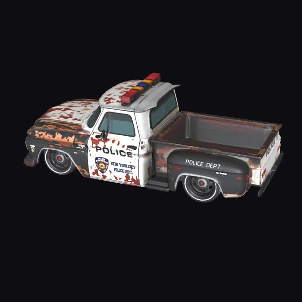 Positioned dynamically, the truck faces left, showcasing its rugged design and detailed features. The body is a mix of white and black, with ‘POLICE’ emblazoned on the door and ‘POLICE DEPT.’ on the tailgate. Blood splatters cover the hood, roof, and sides, while the black bed and wheels show signs of rust and wear. The emergency light bar on top adds a pop of color amidst the grim details. This model excels in applications requiring a blend of realism and stylized grit, such as games, animations, or VR/AR experiences focused on emergency services or post-apocalyptic settings.