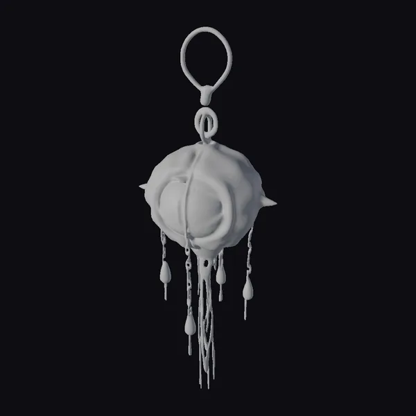 Suspended from a metal hoop, the earring showcases a grotesque eyeball with a bloodshot iris and a black pupil, surrounded by a halo of red veins. Chains and teardrop-shaped red beads hang like macabre tassels, adding to the unsettling effect. The earring’s texture and shading evoke a sense of realism, making it perfect for horror-themed designs, games, or animations. Its uniqueness and level of detail make it an asset for projects requiring a touch of the macabre.