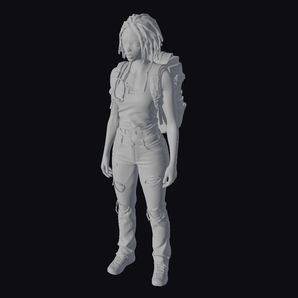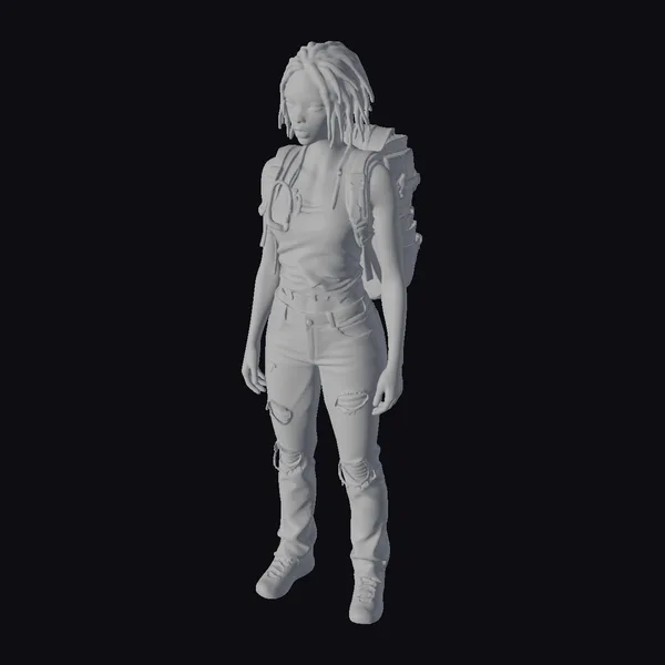 Detailed with precision, this 3D model of a female survivor showcases a realistic portrayal of a young woman, likely in a post-apocalyptic setting. Her dreadlocked hair and backpack suggest she’s been on the move for a while. The ripped and bloody jeans, along with the stained white tank top, tell a story of survival and resilience. Her gaze is downward, perhaps assessing her next move or reflecting on recent events. The model is highly detailed, from the texture of her skin to the wear and tear on her clothing, making it suitable for projects requiring a realistic character. Use it in games, animations, or any project that requires a character who embodies survival and grit.
