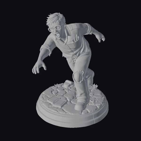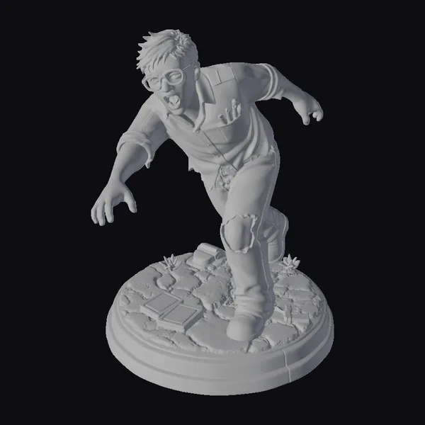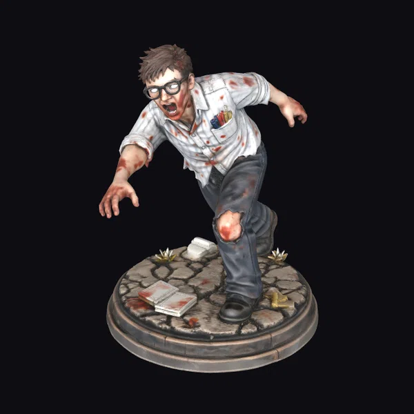 This meticulously crafted 3D model depicts a zombie office worker in a dynamic, twisted pose, as if he’s about to lunge forward. His office attire, once crisp and professional, now clings to his body, stained and torn, with visible blood splatters across his white shirt and dark pants. A significant wound on his knee suggests a violent history. The model’s base, designed to look like cracked pavement, includes scattered items such as a blood-stained book and a broken computer mouse, enhancing the apocalyptic atmosphere. The level of detail, from the texture of the skin to the expression of terror on his face, makes this model suitable for high-quality projects, including games, animations, and VR/AR experiences.