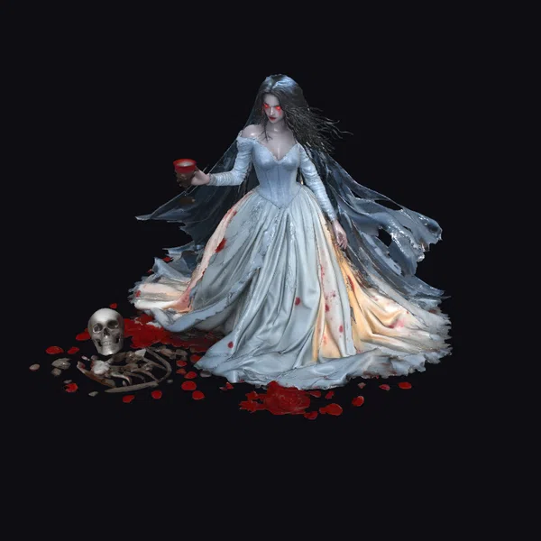 Detailed with precision, this vampire bride 3D model showcases intricate textures and a dynamic pose, her long, flowing black hair and veil contrasting with the pristine, yet blood-stained, white wedding dress. The model includes a variety of details such as a bloody goblet in her hand, a skull and bones at her feet, and splatters of blood around her, creating a vivid scene of dark fantasy. Suitable for use in horror games, animations, or as a striking piece of digital art, this model brings a touch of the macabre to any project.