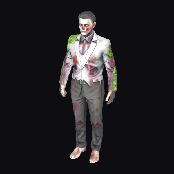 Stumbling into the scene with an unsettling presence, this zombie businessman exudes a chilling aura. His white suit jacket and gray pants are tattered and stained with blood and green moss, indicating a long decay. Barefoot and with red eyes, he embodies a terrifying rebirth.