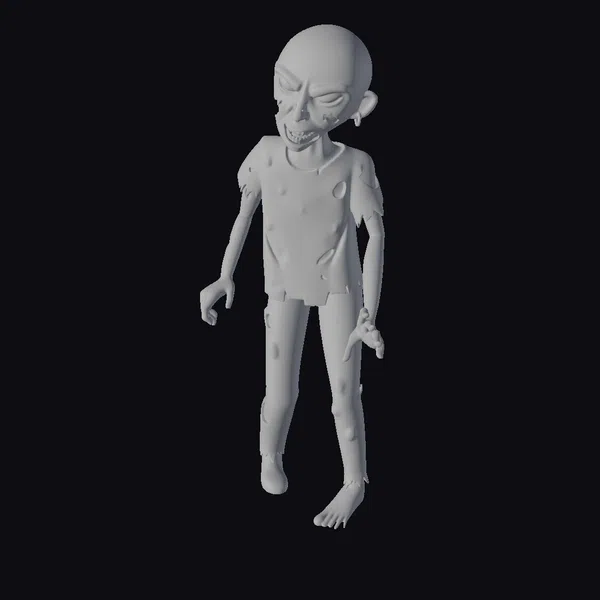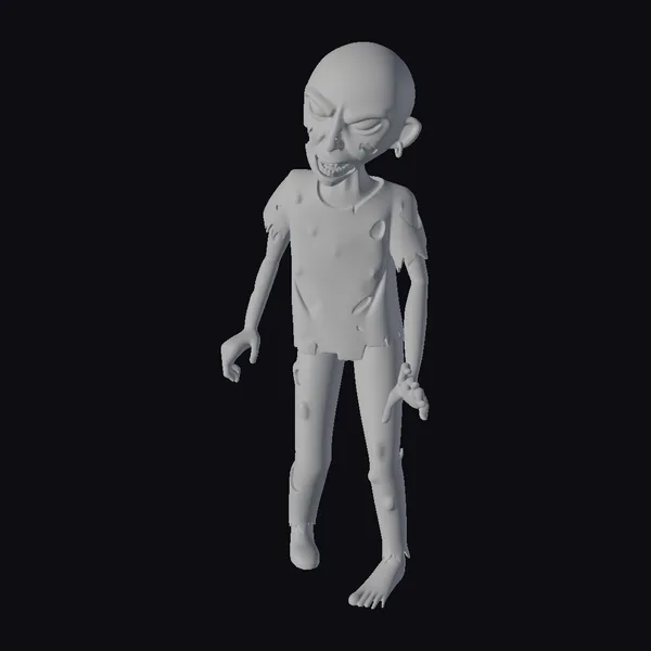 Standing with a slouched posture, this zombie’s bald head is a canvas of blood splatters and open sores, its face twisted into a grimace. The model’s tattered shirt and pants are stained with blood, while its left foot is bare, adding to the overall sense of decay. The texture of the skin is rough and decaying, with visible wounds and lesions. The eyes are sunken and dark, adding to the unsettling atmosphere. This level of detail makes it an excellent choice for projects requiring a realistic and terrifying undead character, such as horror games, animations, or VR experiences.
