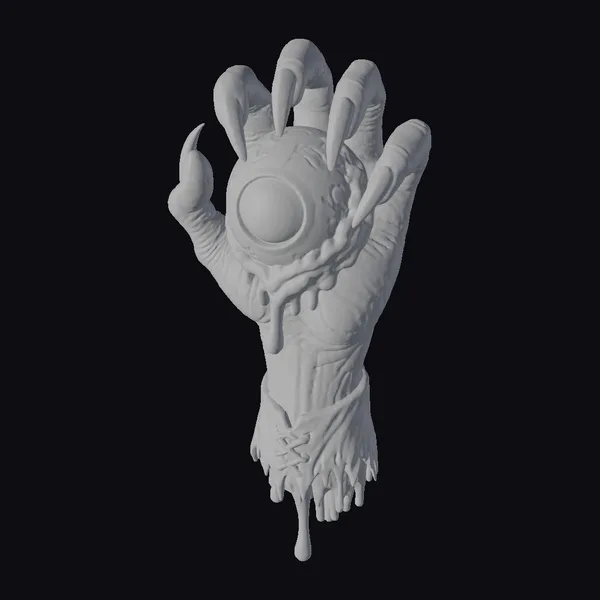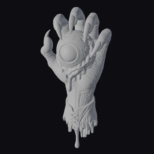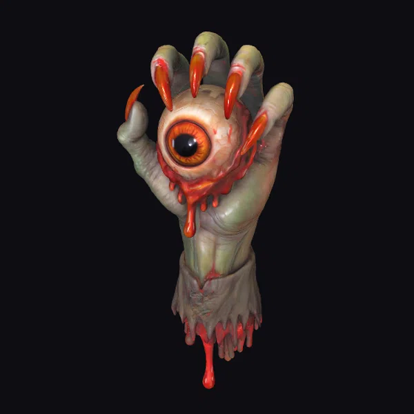 This unsettling zombie hand model showcases a level of detail that will leave you shuddering. The palm of the hand has transformed into a grotesque, bloodshot eye, complete with a black pupil and orange iris. The eye appears to be bulging from the skin, with blood vessels visibly strained. The five fingers are long and skeletal, each tipped with sharp, blood-red nails that seem to be grasping for prey. The wrist and forearm are covered in tattered, grayish-green skin, with blood dripping from the edges, suggesting a fresh and gruesome wound. The overall pose conveys a sense of sudden movement, as if the hand is about to lunge forward. This model would be perfect for horror-themed games, animations, or 3D prints, offering a chilling addition to any dark fantasy or horror project.