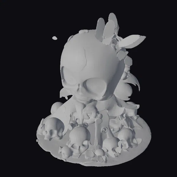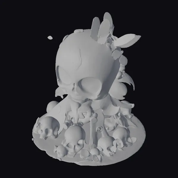 Perched atop a cluster of smaller skulls, the central skull gazes out with eyes that burn like embers, casting an eerie glow. The white bone is splattered with patches of blue and purple, as if the very essence of life is seeping into death. Delicate, almost translucent petals in shades of pink and purple dance around the skulls, adding a touch of ethereal beauty to the macabre scene. The base of the sculpture is a deep, rich purple, with tendrils of the same color snaking around the smaller skulls. This piece would be perfect for use in games, 3D printing, VR/AR experiences, animation, or as a design element in projects that call for a touch of the fantastical and unknown.