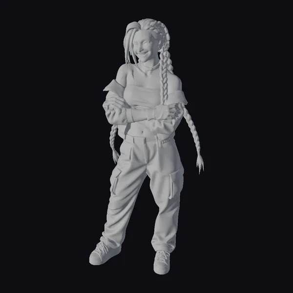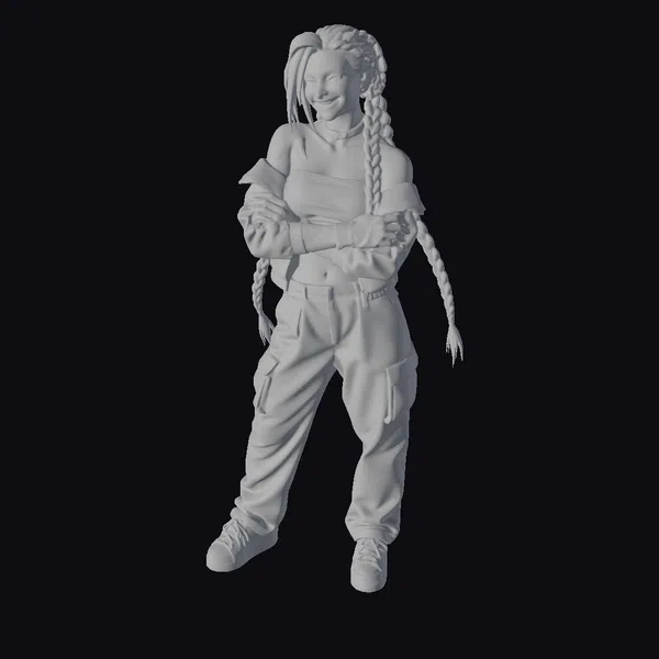 Detailed with precision, this stylized 3D model showcases a young woman with an edgy yet fashionable vibe. Her bright blue braids cascade down her back, complemented by a series of tattoos on her arms and torso. She wears a black off-shoulder jacket with red accents, paired with gray cargo pants and white sneakers. The model’s confident stance and smile add to her charismatic presence. Ideal for projects requiring a dynamic, modern character, such as animations, games, or virtual reality experiences.