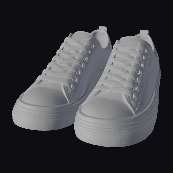 Detailed with precision, these blue canvas sneakers boast a sturdy white sole with two black stripes, while the upper part features a vibrant blue canvas material. The white laces are meticulously tied, adding to the realistic look. A small red tag with white writing is visible on the side of one shoe, adding a touch of authenticity. These sneakers are perfect for designers looking to add a casual, cool element to their 3D projects, whether it’s for animation, game design, or virtual reality experiences.