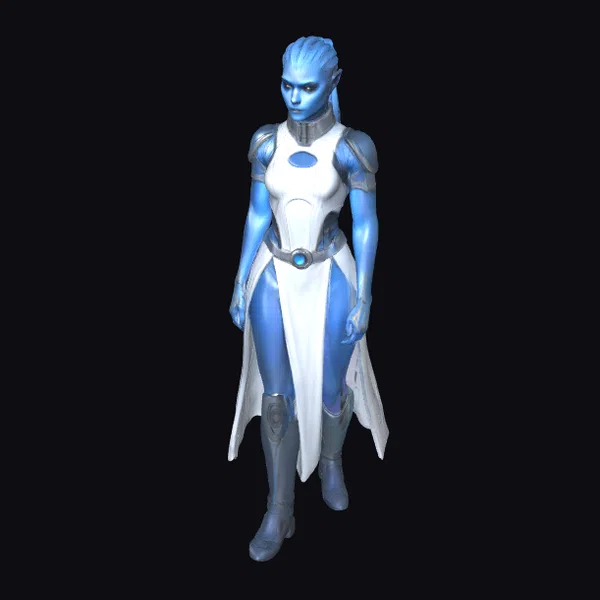 Standing tall with a poised stance, this intricately detailed model showcases a female warrior with a mesmerizing blue hue that covers her skin, complemented by a white and silver armor set. The armor features a distinctive design with a high collar, shoulder pads, and a flowing cape that adds a dynamic element to her appearance. Her facial features are accentuated by a sleek, pulled-back hairstyle, adding to her otherworldly allure. The model is meticulously crafted with high-quality textures and shading, making it suitable for a variety of applications including game development, animation projects, and virtual reality experiences.