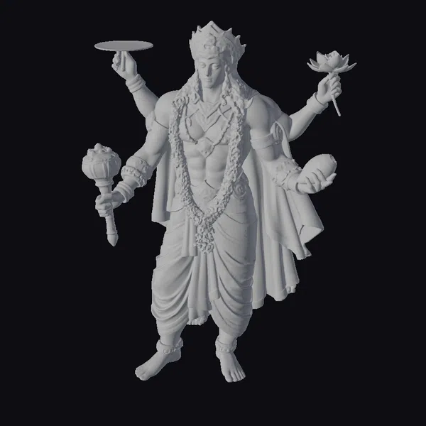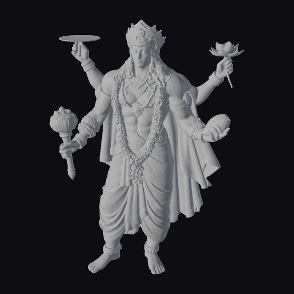 Rendered in exquisite detail, this four-armed deity boasts a radiant blue complexion, complemented by golden accents on his crown, necklaces, bracelets, and dhoti. His attire is a masterful blend of purple and gold, with a delicate white garland draped across his chest. Each of his four arms holds a distinct object: a discus, a conch shell, a lotus flower, and a mace, symbolizing his multifaceted powers. The deity’s facial expression is calm and benevolent, inviting reverence. This model is perfect for projects requiring a realistic, mythologically accurate representation of a Hindu deity, suitable for games, animation, 3D printing, and architectural visualization.