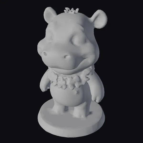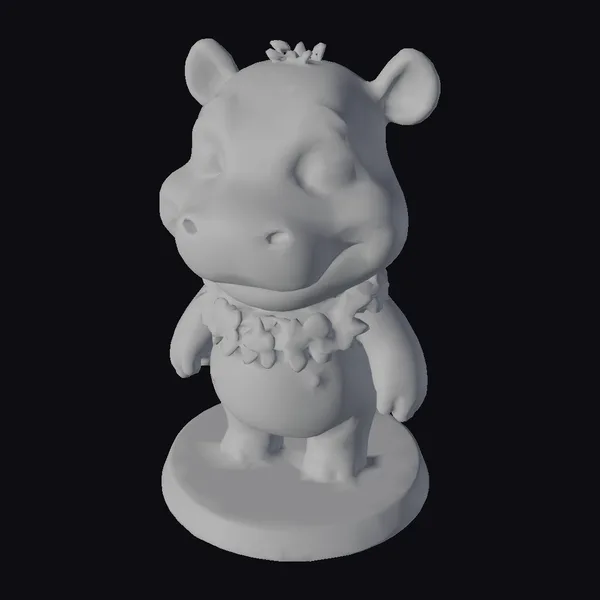 Perched on a sturdy base, this blue hippo figurine stands out with its large, expressive eyes and adorable facial wrinkles, all meticulously detailed to evoke a sense of friendliness. The hippo’s ears, painted with soft pink and yellow gradients, add a touch of warmth and charm. A colorful floral necklace encircles its neck, comprising pink, orange, purple, and yellow flowers that contrast beautifully with the hippo’s blue skin. The model showcases a blend of realistic and stylized elements, making it perfect for use in games, animations, or as a 3D printed collectible. Its cute and playful demeanor is sure to appeal to a wide range of audiences.