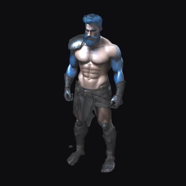 Standing with a powerful stance, this blue-painted warrior showcases a blend of strength and agility. The character’s physique is defined but not bulky, highlighting an athletic build. The blue paint covering the face, beard, and arms contrasts sharply with the bare torso and legs. Equipped with a metallic shoulder guard, gloves, and boots, along with a cloth wrapped around the waist, the warrior exudes a sense of readiness. The detailed textures and lighting enhance the character’s features, making it suitable for various applications such as game development, animation, and virtual reality experiences.