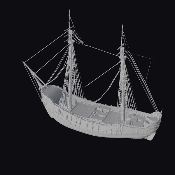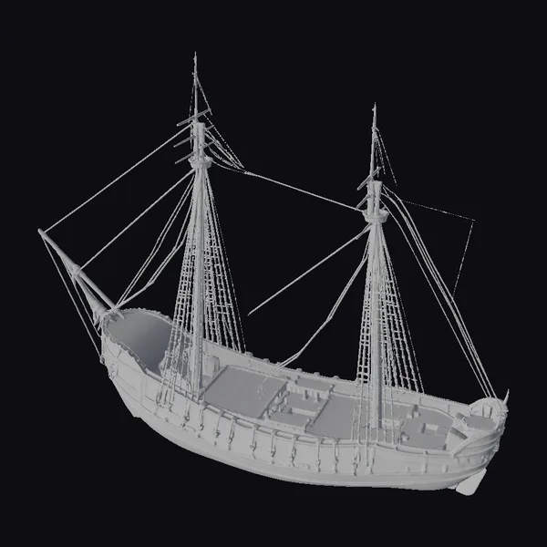Positioned dramatically on the precipice of a digital cliffside, the blue sailing ship’s hull and superstructure are meticulously detailed. The worn, blue paint and wooden decking are complemented by the complex network of ropes and sails, which appear ready to harness the wind. The ship’s pose, with sails partially unfurled, suggests movement and energy. This model is perfect for use in games, 3D printing, VR/AR experiences, animation, and design projects, offering a richly detailed and historically inspired asset.