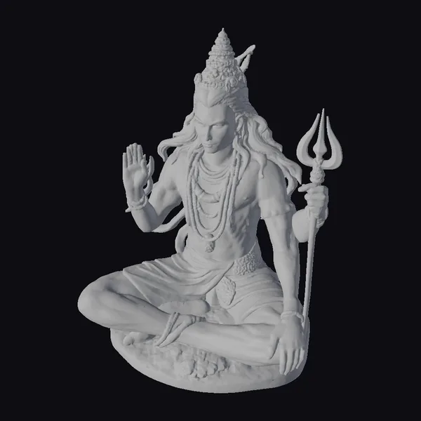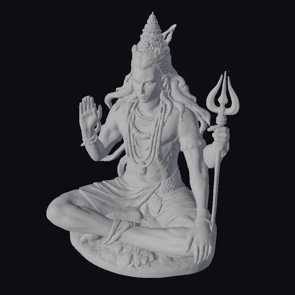 This detailed 3D model of Shiva captures the essence of the Hindu deity in a serene, meditative pose. Shiva sits cross-legged with his right hand raised in a calming gesture and his left hand resting on his knee, holding a trident. The statue features a blue-gray color with a subtle sheen, emphasizing its tranquil mood. The crown on Shiva’s head is intricately designed, adding to the overall ornateness of the model. The base of the statue is decorated with patterns, enhancing its visual appeal. This model is perfect for use in games, 3D printing, VR/AR experiences, animations, and designs where a mythological or historical element is required.