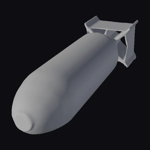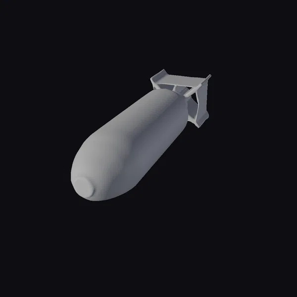 Positioned dynamically, the bomb’s elongated body dominates the scene, with a weathered metallic texture that suggests a storied past. The bright yellow tail fins provide a jarring contrast to the otherwise muted tones of the bomb’s body. A series of ominous markings adorn the surface, adding to the sense of foreboding. As a 3D model, this bomb is primed for use in a variety of applications, from game development to architectural visualizations, and even animation projects. Its detailed design and realistic appearance make it an excellent choice for creators seeking to add a touch of realism to their work.