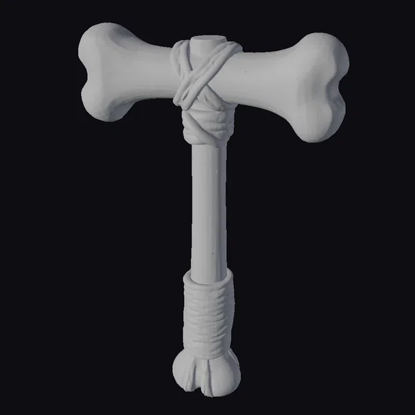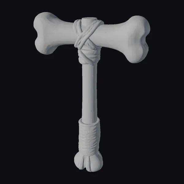 Detailed with texture and lighting that accentuates its ruggedness, this bone club model showcases a femur bone shaped into a T-form, bound with coarse brown rope. The rope wraps around both the handle and the end of the club, suggesting a primitive yet effective design for bludgeoning. The bone’s surface shows natural cracks and a worn texture, adding to its authenticity. Ideal for use in dark fantasy games, animations, or as a prop in design projects, this model brings a touch of ancient brutality to any scene.