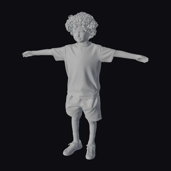 Detailed from head to toe, this 3D model of a young boy showcases a curly afro hairstyle, a light blue short-sleeved t-shirt, white shorts with a side pocket, white socks with two black stripes, and white sneakers. His arms are outstretched to the sides, capturing a moment of joy or balance. The model’s realistic style makes it suitable for various applications, including games, animation, virtual reality (VR), augmented reality (AR), and design projects. The high level of detail, especially in the facial features and hair, adds to its versatility and usability.