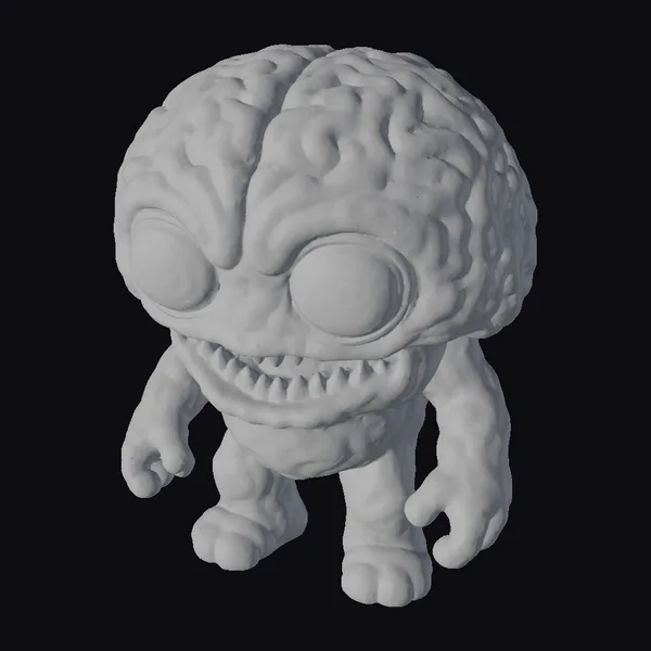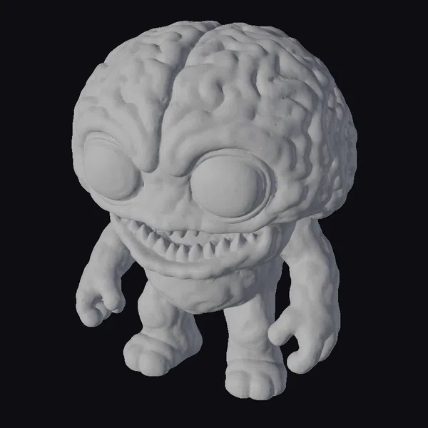 This stylized creature boasts a brain for a head, complete with intricate pink and blue swirls that dance across its body. Its eyes glow with an otherworldly light, their spiral patterns drawing in the viewer. With sharp teeth and a wide, cheeky grin, this monster exudes a playful energy. Its pose, with arms slightly bent and legs positioned for action, suggests a dynamic presence. This model is perfect for use in games, animations, or as a unique design element, offering a blend of whimsy and fantasy.