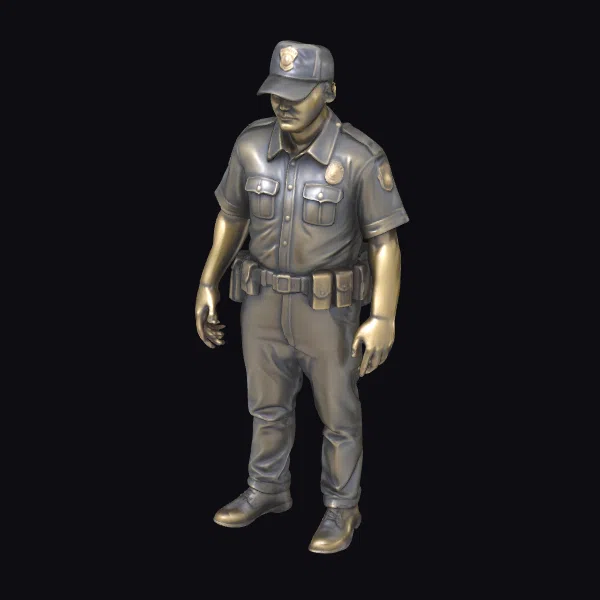 This brass police officer statue stands with his arms relaxed by his sides, hands in a neutral position. He wears a baseball cap adorned with a badge, a short-sleeved uniform shirt with patches and a badge, and a belt with a utility pouch. The statue showcases a high level of detail, from the folds of his clothing to the sheen of the brass. The uniform is a blend of gray and gold tones, capturing the essence of a law enforcement officer. The statue’s realistic style makes it suitable for various applications, including decoration, games, 3D printing, virtual reality, and animation.