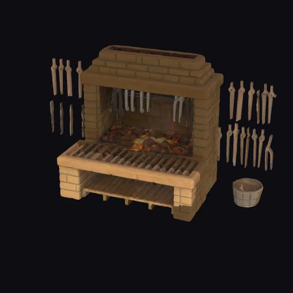 Imagine stepping into a backyard gathering where the mouthwatering aroma of grilled meat fills the air. This realistic brick BBQ grill setup, adorned with a brick structure, grill grate, and skewers of sizzling meat, captures the essence of a perfect outdoor cooking experience. The model includes an assortment of utensils and a bucket, adding to its authenticity. The grill’s brick exterior and the flickering flames inside create a cozy atmosphere, perfect for games, animations, or architectural visualizations. Its detailed textures and pose make it an excellent addition to any outdoor scene.