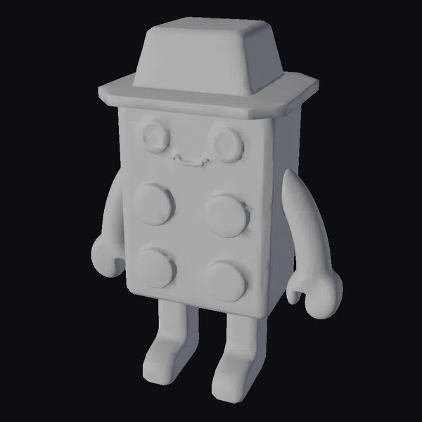 Detailed with a bright yellow hat and a warm smile, this brick character is posed in a friendly stance, showcasing its playful and approachable personality. The model features a simple yet charming design, with a predominantly orange body, gray legs, and brown arms. The character’s facial features include large, expressive eyes and a curved smile, adding to its appeal. The hat, with its brown band, adds a touch of detective flair. This model is perfect for use in animations, games, or as a decorative piece, bringing a touch of whimsy and fun to any project. Its colorful and playful nature makes it an excellent choice for kids’ content or family-friendly media.