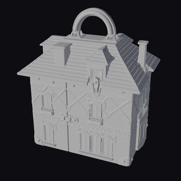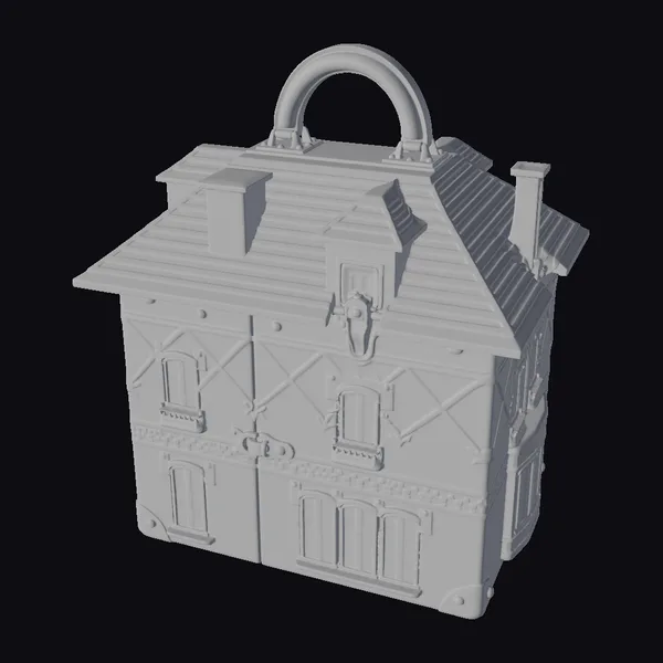 Floating dynamically on a clean white background, this stylized brick house handbag showcases its unique design. The model features a white roof with snow-like texture, adorned with two chimneys and a golden handle. The facade is a mix of white and red patterns, complete with six windows and golden details. The bag’s corners are protected by golden feet, adding to its playful charm. This decorative piece can be used in various applications, such as 3D printing, animation, or virtual reality, and is perfect for designers looking for a fashionable and eye-catching prop.