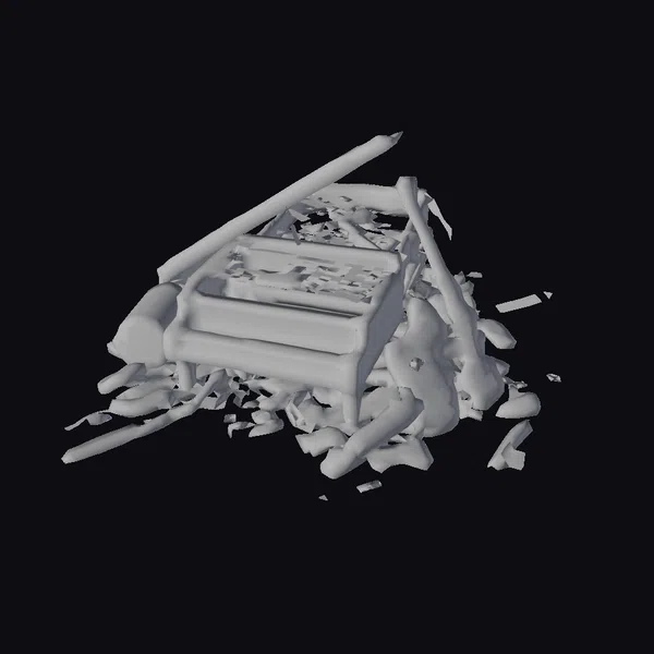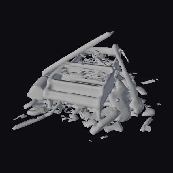 In a scene of utter devastation, a large pile of broken music instruments seems to have been ravaged by an unseen force. The piano, once a proud centerpiece, now lies shattered, its keys scattered and its body cracked. A guitar, similarly destroyed, leans against the piano, its neck snapped and its body crushed. Other fragments of instruments, including what appears to be a violin and a drum, are strewn about the pile, adding to the sense of chaos and destruction. The textures of the broken wood and metal are starkly visible, with the piano keys still clinging to their white and black coloring. The lighting highlights the jagged edges and rough surfaces, emphasizing the destruction. This 3D model would be perfect for scenes requiring a sense of devastation or chaos, such as in animations, games, or architectural visualizations.