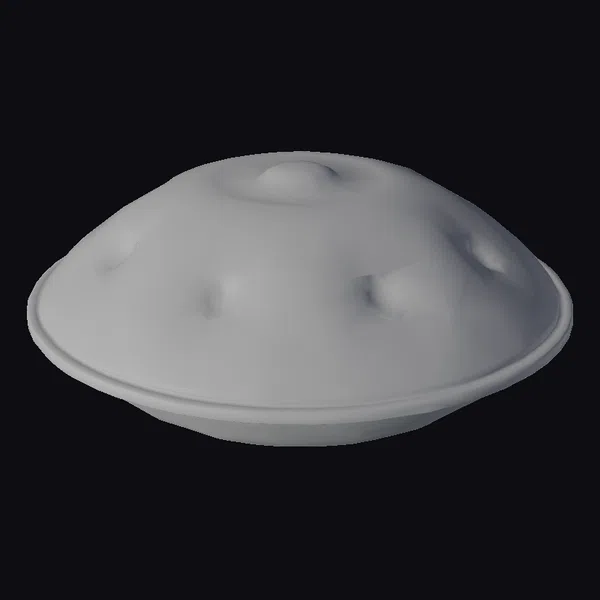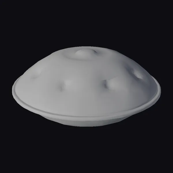 The bronze hang drum sits proudly, its domed shape rising from a sleek black base. The instrument’s surface features an intricate pattern of concentric circles and teardrop-shaped holes, adding to its cultural allure. As light dances across its surface, the bronze material shimmers with a warm, earthy glow. The drum’s texture appears smooth, inviting the viewer to touch. This 3D model would be perfect for projects requiring a realistic, detailed instrument, such as animations, games, or architectural visualizations. Designers and artists can use it to add a touch of authenticity to their work.