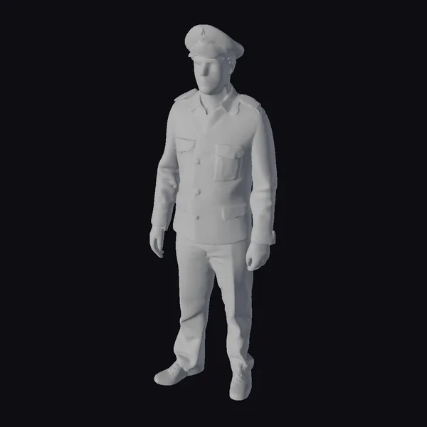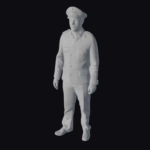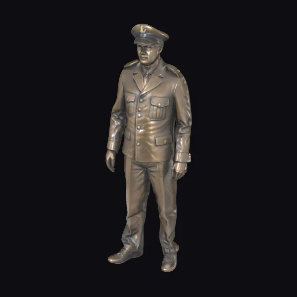 The statue depicts a male sailor standing upright, both arms down by his sides, exuding a sense of calm authority. The uniform is meticulously detailed, with clear definitions of the jacket’s pockets, the insignia on the cap, and the folds of the fabric. The bronze material gives the statue a rich, earthy tone that suggests a sense of history and tradition. The pose is confident, with feet shoulder-width apart, emphasizing stability and strength. This level of detail makes the statue suitable for a variety of applications, including games, 3D printing, virtual reality, animation, and design projects, where a realistic and historically accurate representation is required.