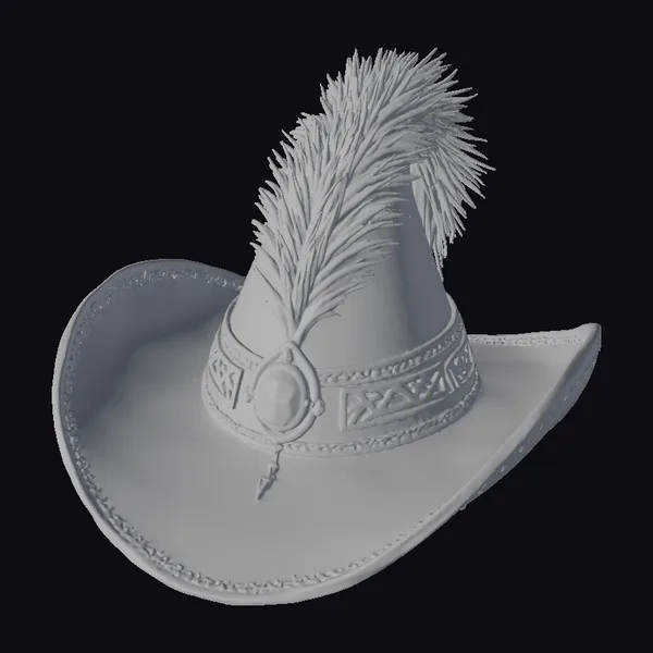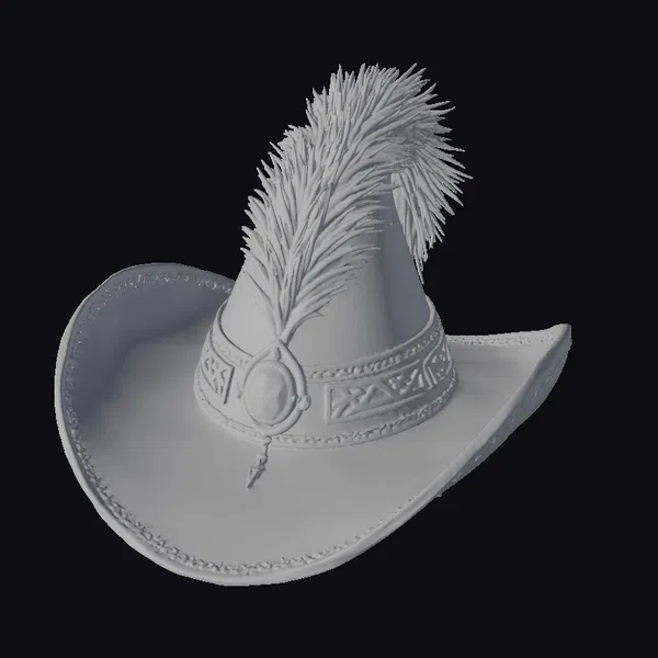 Crafted with meticulous attention to detail, this brown leather hat features a high crown and wide brim, complete with a luxurious black feather tucked into its band. The hat’s leather texture is rich and supple, with visible stitching that adds to its rugged charm. A stunning emerald gemstone, set in a golden frame, adorns the front of the hat, accompanied by intricate golden filigree and a dangling leaf-shaped pendant. The hat’s band is wide and ornate, featuring Celtic-inspired knotwork that adds to its fantastical allure. Whether you’re creating a character for a game, animation, or 3D print, this hat is sure to make a statement. Its unique blend of rugged practicality and high-end fashion makes it perfect for adventurers, fantasy heroes, or anyone looking to add a touch of sophistication to their look.