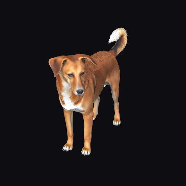 Rendered in exquisite detail, this 3D model of a brown dog captures the essence of a domestic pet with striking realism. The dog’s coat is a warm, earthy brown with white markings on its chest and paws, complemented by a distinctive black and white tail that curls upwards. Its floppy ears and long snout give it a friendly appearance, while its stance suggests a moment of pause, as if it’s about to move or respond. The model’s texture and lighting are finely tuned to mimic real fur and skin, making it suitable for projects requiring a lifelike canine character. Ideal for use in animations, games, virtual reality experiences, or as a detailed addition to 3D environments, this model brings warmth and authenticity to any scene.
