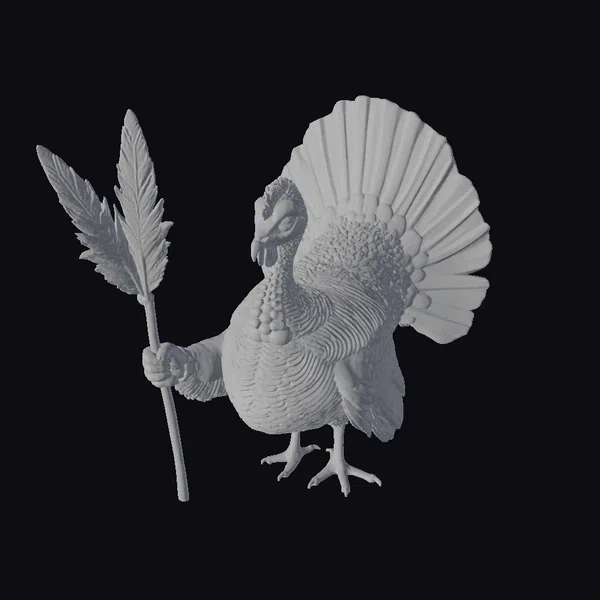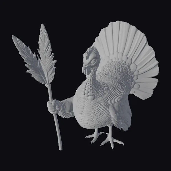 Gaze upon a magnificent, stylized turkey standing tall, grasping a feather in its hand. Its body is adorned with intricate, textured feathers in warm shades of brown, complemented by a striking red wattle and vibrant tail feathers that gradate from orange to yellow. The bird’s expressive eye and poised stance convey a sense of confidence and playfulness. This delightful model is ideal for use in various creative projects, such as games, animations, and designs that require a lighthearted, festive touch. Its detailed features and bright colors make it a captivating addition to any visual narrative.