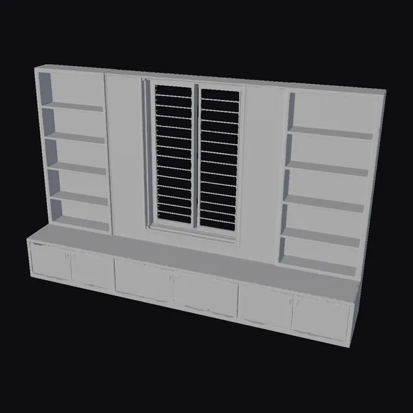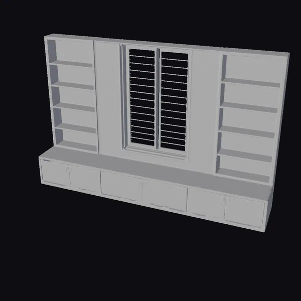 Perched against a crisp white wall, this expansive brown wooden bookshelf stretches upwards, its multiple shelves offering ample space for treasured tomes and decorative items. The focal point is undoubtedly the large window at its center, framed in sleek black and adorned with horizontal blinds that filter the light. Below, a row of cupboards provides additional storage, completing this piece as a functional and stylish addition to any room. Ideal for use in interior design projects, architectural visualizations, or even 3D animation scenes, this model brings a touch of modern comfort to digital spaces.