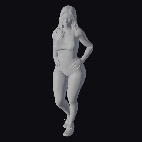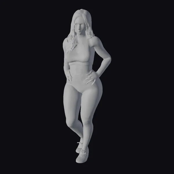 Crafted with meticulous attention to detail, this 3D model showcases a Caucasian-European brunette woman embodying the essence of fitness and style. Standing with one leg playfully crossed over the other, she places her hands assertively on her hips, accentuating her hourglass figure. Her long, brunette hair cascades down her back, complementing her athletic yet curvaceous physique. The model wears a dark-purple ensemble consisting of a sports bra, high-waisted spandex leggings, and matching sneakers, all meticulously textured to mimic real-world materials. The realistic rendering captures the sheen of her sports attire against her skin, set against a clean, white background that highlights her figure. Ideal for projects requiring a modern, active woman, this model is versatile for use in fitness promotions, fashion projects, or digital animations where a realistic, engaging character is needed.