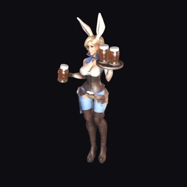 Detailed from her rabbit ears to her knee-high boots, this stylized bunnygirl barmaid exudes a playful charm. Her blonde hair is tied up, revealing large, expressive eyes and a cheeky grin. She wears a brown leather corset, light blue shorts, and brown boots, perfect for a fantasy tavern setting. Holding a tray of four beers in one hand and a single beer in the other, she’s ready to serve. Her pose and textures evoke a mix of fable and Team Fortress 2 art styles, making her a unique addition to any project. Ideal for games, animation, or 3D printing, this model brings a lively atmosphere to your scene.