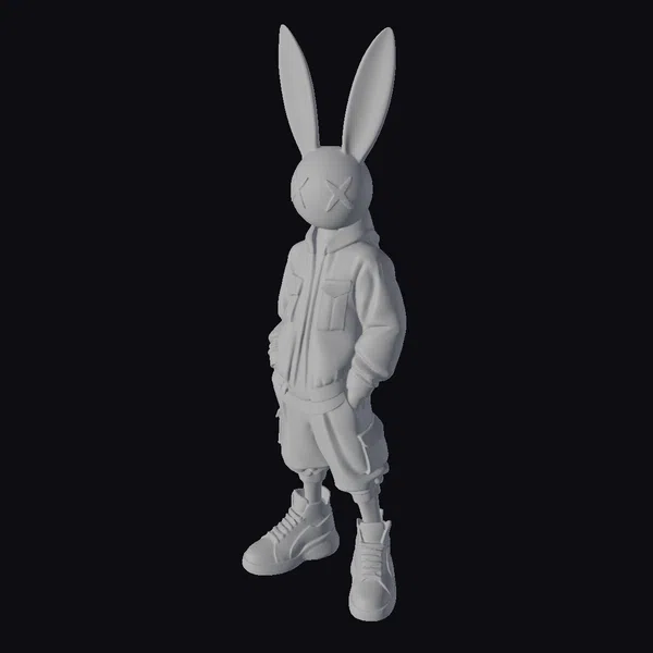 Standing confidently with hands tucked into pockets, this anthropomorphic bunny boasts an eye-catching appearance. The camouflage jacket and pants feature a dynamic mix of blue, pink, and white hues, complemented by a black mask adorned with white stars. Oversized sneakers with orange laces add a sporty touch. The character’s pose and attire evoke a sense of urban chic, making it an excellent choice for projects requiring a unique, stylized character. Textures are smooth, with crisp lines defining the outfit and character design. Lighting accentuates the model’s features, highlighting its playful demeanor. Ideal for use in games, animations, or as a distinctive design element, this bunny model brings a fresh, creative energy to any scene.