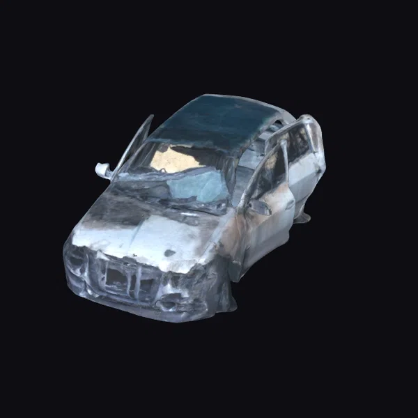 This ravaged vehicle presents a haunting spectacle, its body severely damaged with gaping holes where windows once were, and a mangled front end that appears to have been crushed. The metal is charred and blackened in places, with a predominantly gray and black color scheme that underscores the destruction. The car’s pose, angled sharply to one side, suggests a dynamic, almost violent, end. The detailed textures, including the warped and melted remains of the dashboard and seats visible through the shattered windshield, add depth to this scene of devastation. Such a model would be perfect for projects requiring a scene of destruction, such as in games, animations, or architectural visualizations depicting post-apocalyptic landscapes.